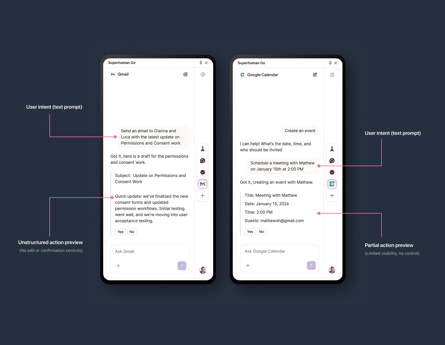 AI agents in Superhuman could take actions like sending emails or creating calendar events, but the experience was constrained to a text-based chat interface. I identified a critical gap: users couldn’t confidently verify or adjust what the agent was about to do before execution.
